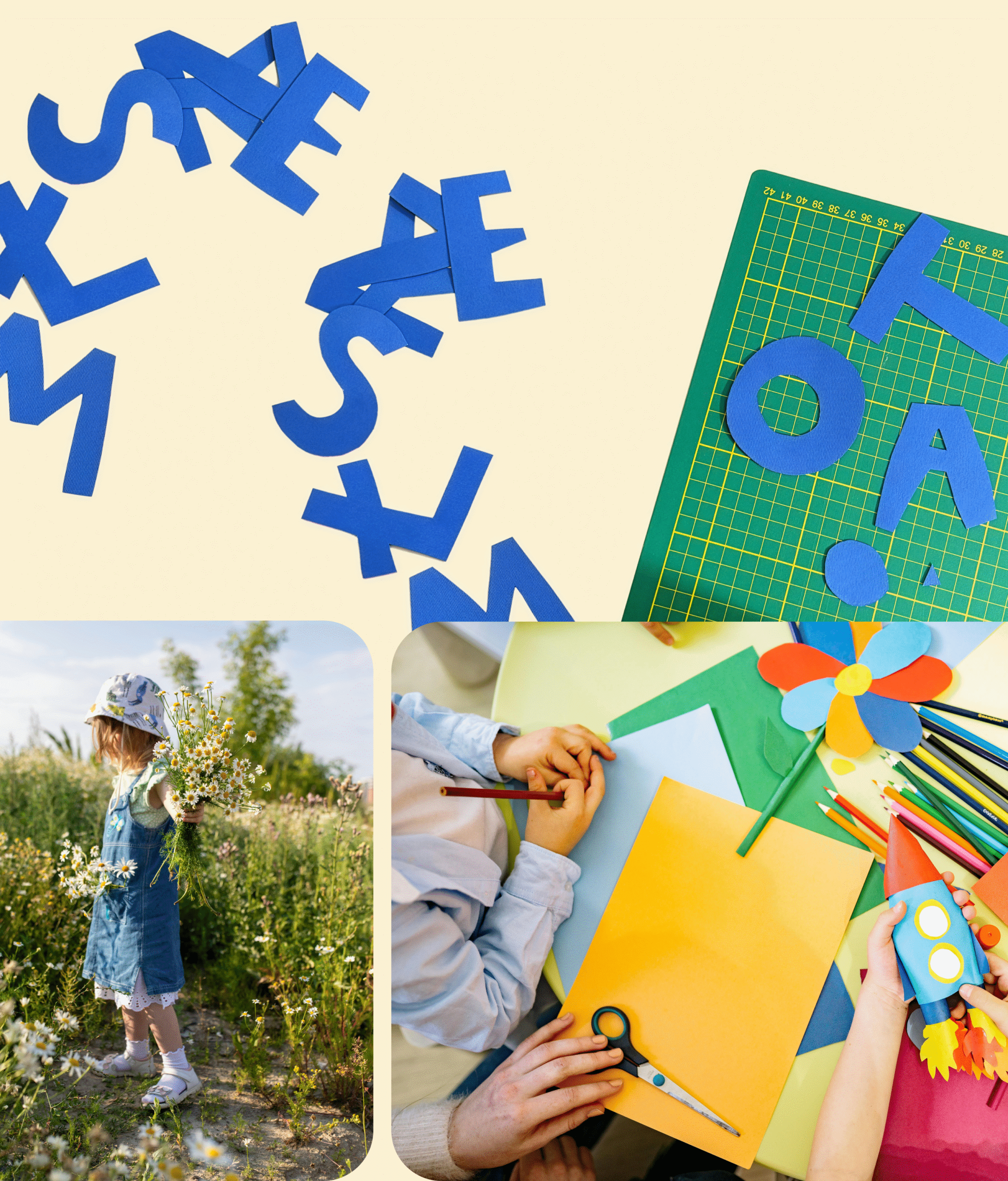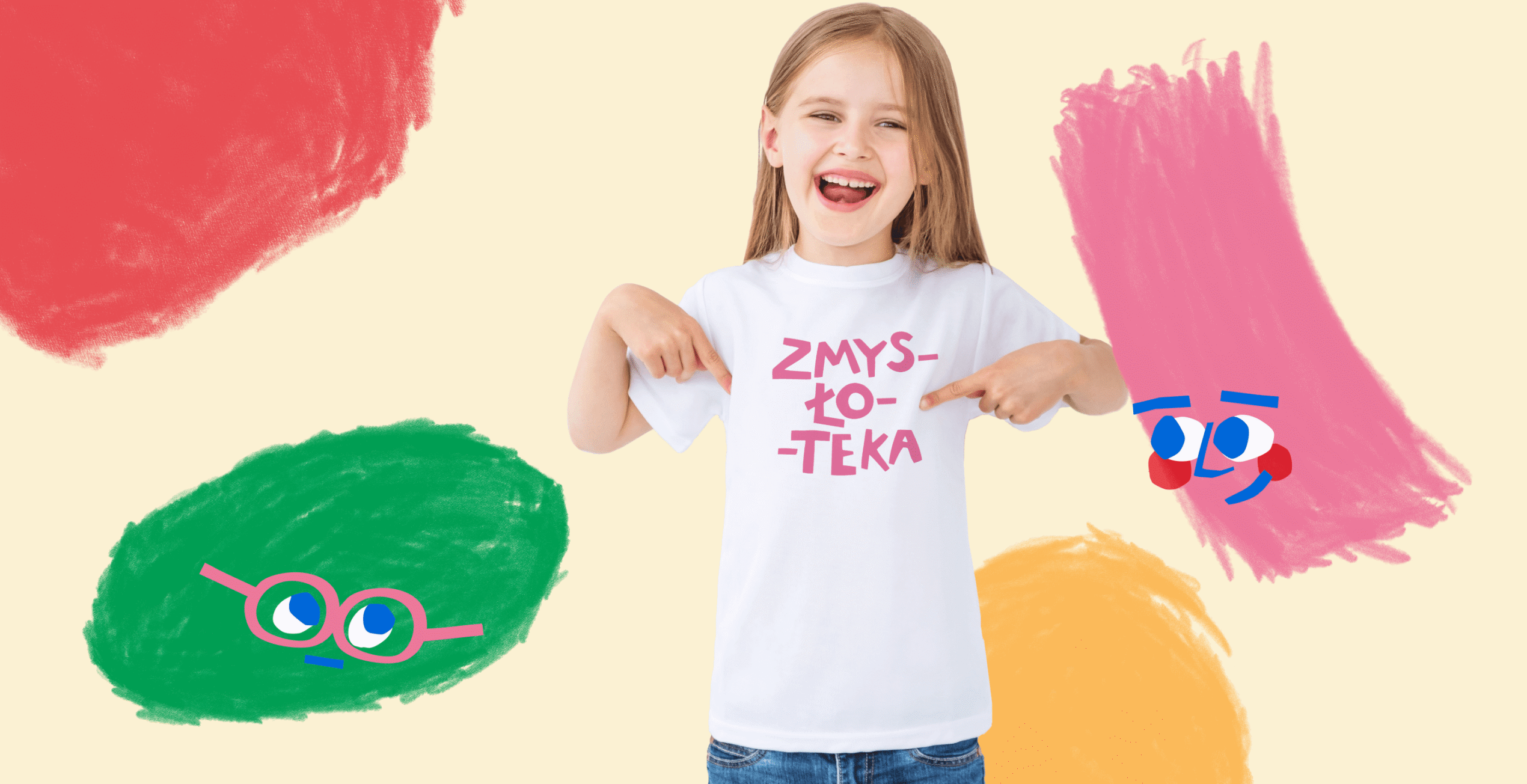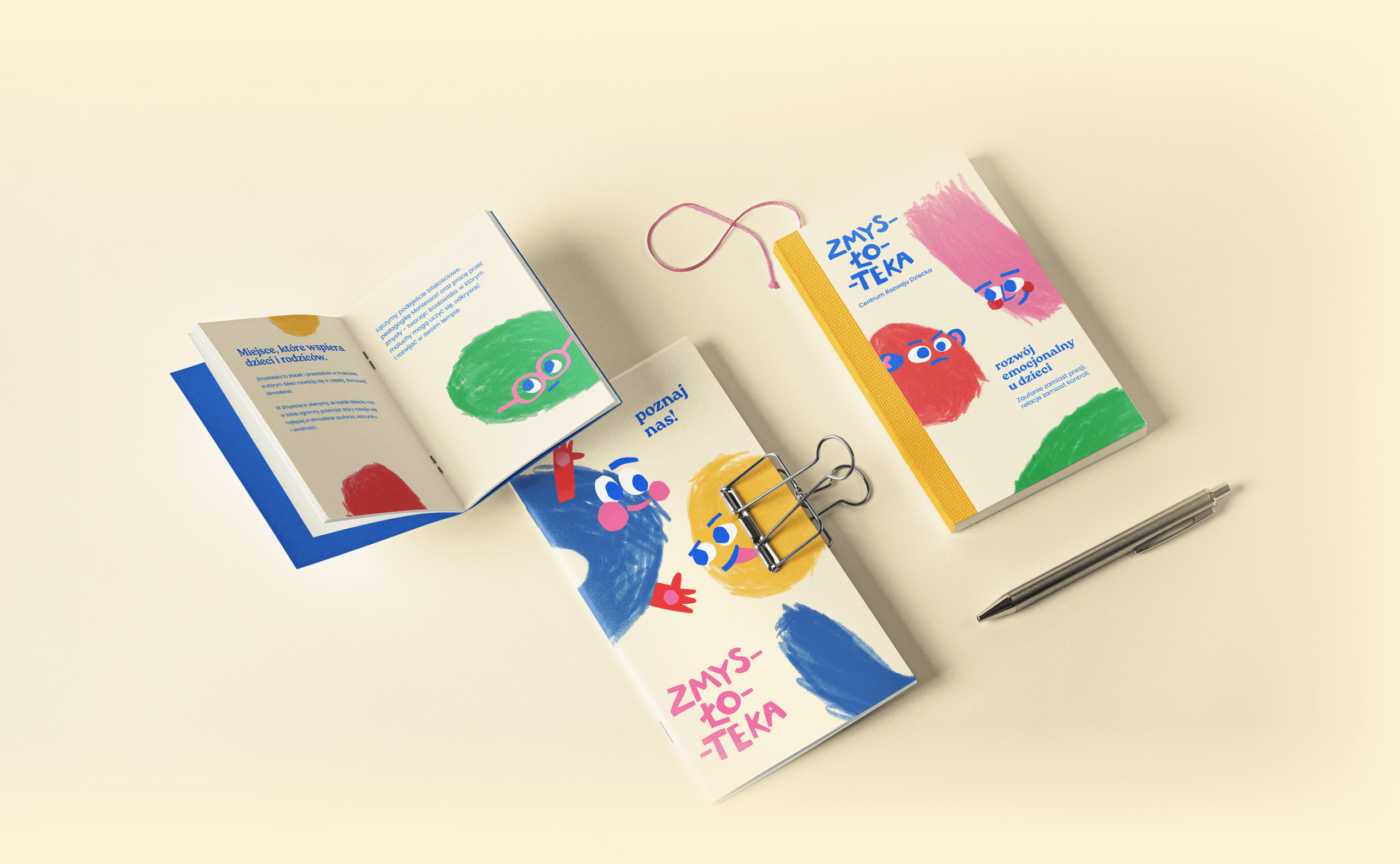 Postawiliśmy na typograficzne logo, zaprojektowane na bazie ręcznie wyciętych liter, nawiązując do dziecięcych wycinanek. Graficznym motywem przewodnim są zmysły, przedstawione jako postacie, zilustrowane kreską charakterystyczną dla dziecięcych rysunków okresu przedszkolnego.